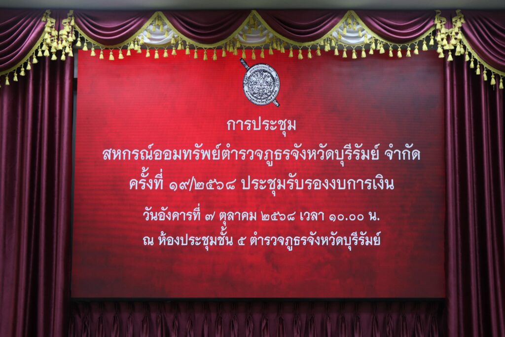 วันอังคารที่ 7 ตุลาคม 2568 เวลา 10.00 น. พ.ต.อ.เจตน์สฤษฎิ์ แพ่งศรีสาร รองประธานฯ ทำหน้าที่แทนประธานกรรมการสหกรณ์ออมทรัพย์ตำรวจภูธรจังหวัดบุรีรัมย์ จำกัด พร้อมด้วย นายเจริญศิลป์ ทุมมาลา นักวิชาการตรวจสอบบัญชีชำนาญการพิเศษ, นายวิทยา มัยสนิท นักวิชาการสหกรณ์ชำนาญการ, นางสาวสุภางค์ เวสารัชอารีย์กุล ผู้สอบบัญชีภาคเอกชน, นางสาวกษมา สมันเรือง ผู้ตรวจสอบกิจการ และคณะกรรมการสหกรณ์ออมทรัพย์ตำรวจภูธรจังหวัดบุรีรัมย์ ,ฝ่ายจัดการประกอบด้วย นางจิรพร ตันตาปกุล ผู้จัดการ, นางพรพรรณ ศรีสังวรณ์ รองผู้จัดการฝ่ายบัญชี, นางปานรดา คงพลปาน รองผู้จัดการฝ่ายสินเชื่อ ร่วมกันเพื่อประชุมรับรองงบการเงินประจำปีงบประมาณ 2568 ณ ห้องประชุมชั้น 5 ภ.จว.บุรีรัมย์ อ.เมือง จ.บุรีรัมย์