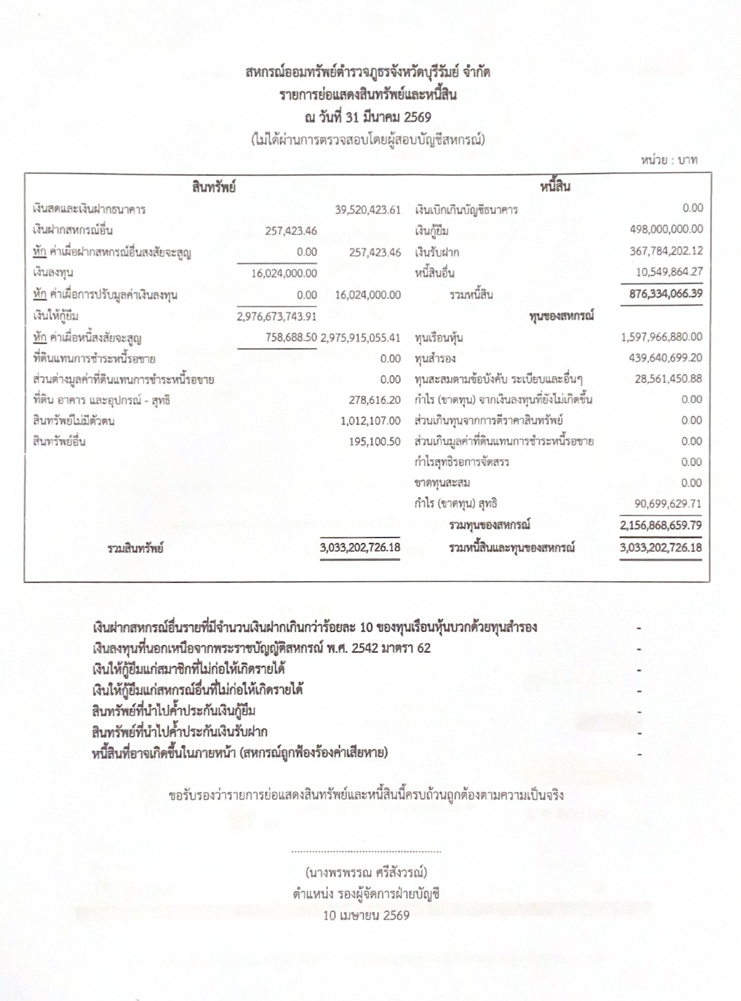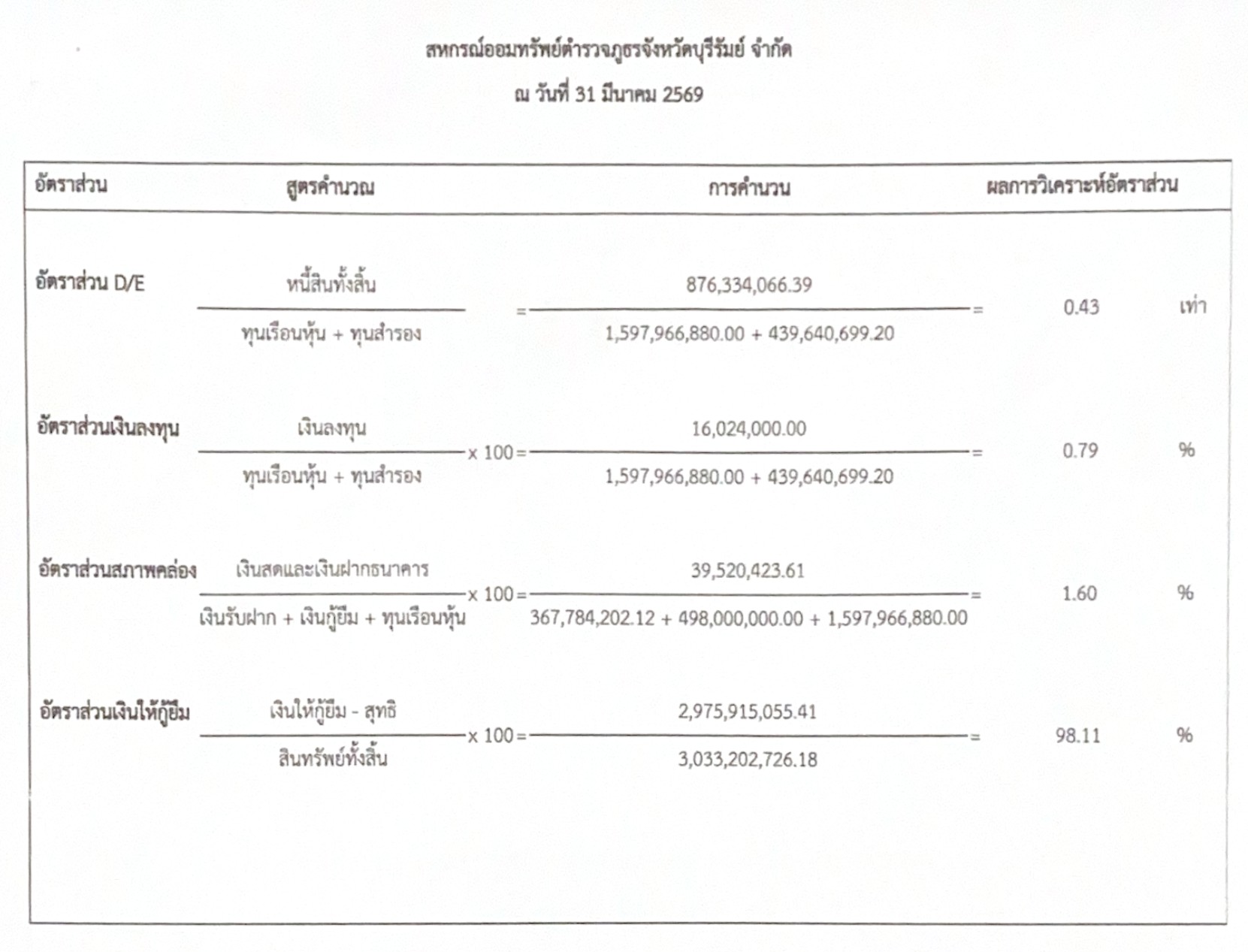 31 มีนาคม 2569 : รายการย่อแสดงสินทรัพย์และหนี้สิน , ผลการวิเคราะห์อัตราส่วน